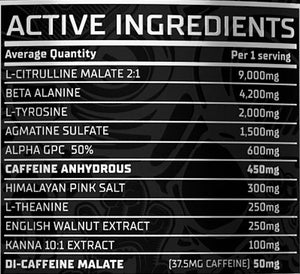 Energy delivery is extreme, featuring 450mg of fast-hitting Caffeine Anhydrous and an additional 50mg of Di-Caffeine Malate (yielding 37.5mg more), backed by 250mg of English Walnut Extract â a stimulant renowned for its euphoric and high-stim impact.