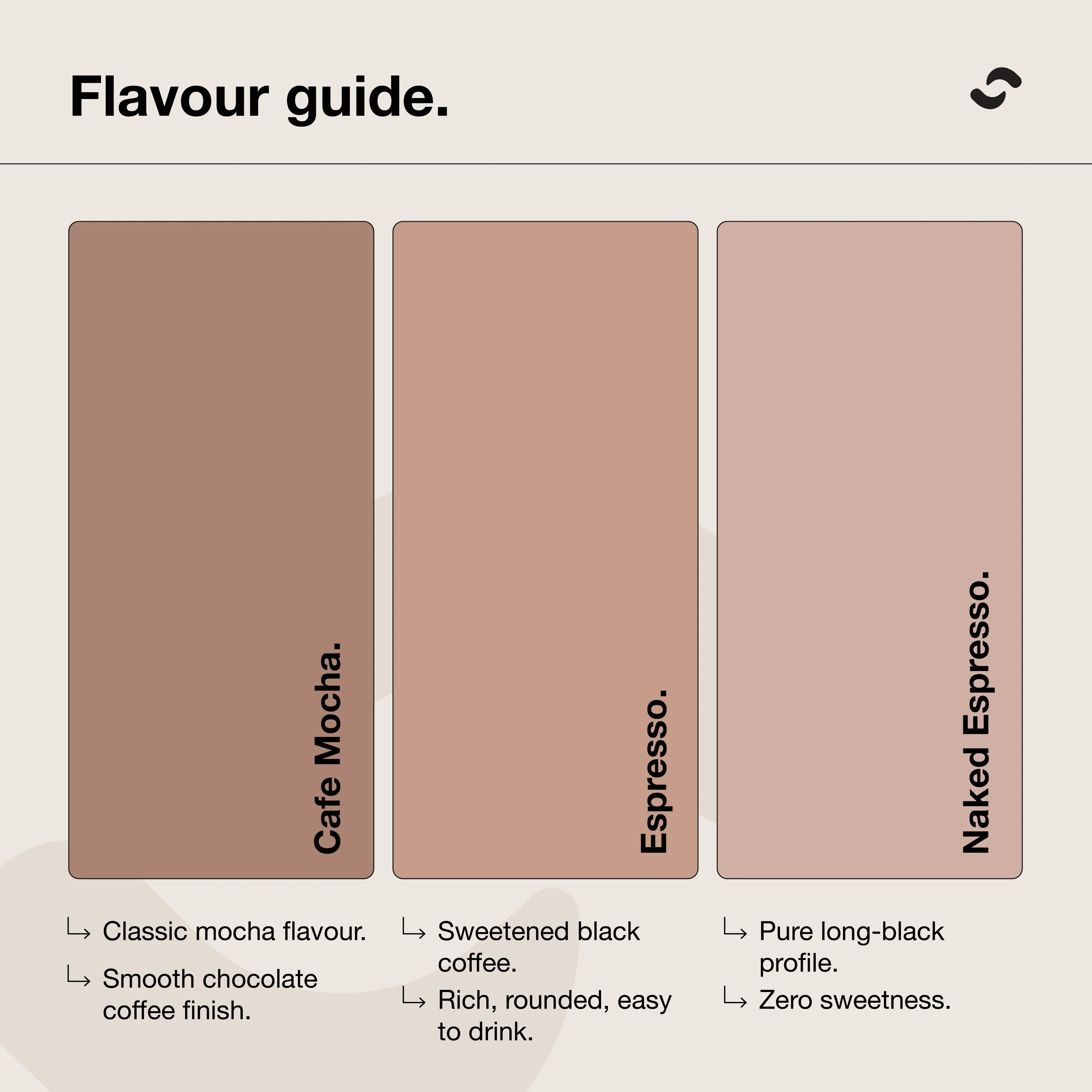 Naked Espresso provides a pure, long-black style profile with zero sweetness for a bold, uncomplicated cup.